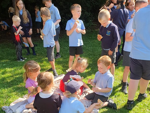 • Walking bus: At 8:40am, we form our safe “walking bus,” with every child wearing a fluorescent tabard, and walk them to school, dropping them off at their classrooms.